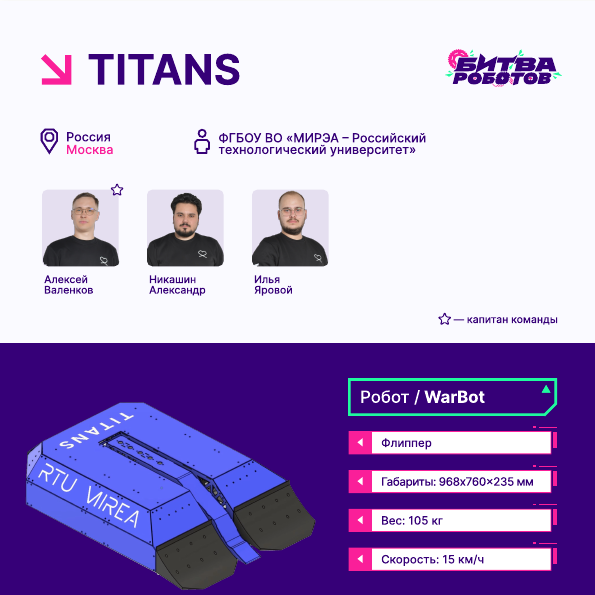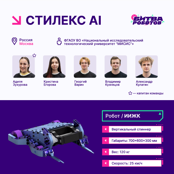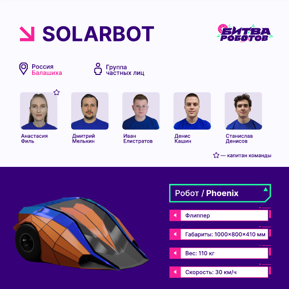 «Битва роботов» — это спортивно-технический чемпионат, на котором инженерные команды соревнуются в проектировании и сражении своих роботов. Соревнования проходят на специализированном высокотехнологичном ринге, где созданные командами роботы наносят друг другу механический урон. Время поединка составляет три минуты, а жюри оценивает степень нанесенного роботами ущерба и определяет победителя. Координацию подготовки и проведения чемпионата осуществляет Минцифры. Оператор чемпионата — АНО «Инженеры и роботы». Генеральный технологический партнёр чемпионата — VK, генеральный индустриальный партнер — «ИКС Холдинг».